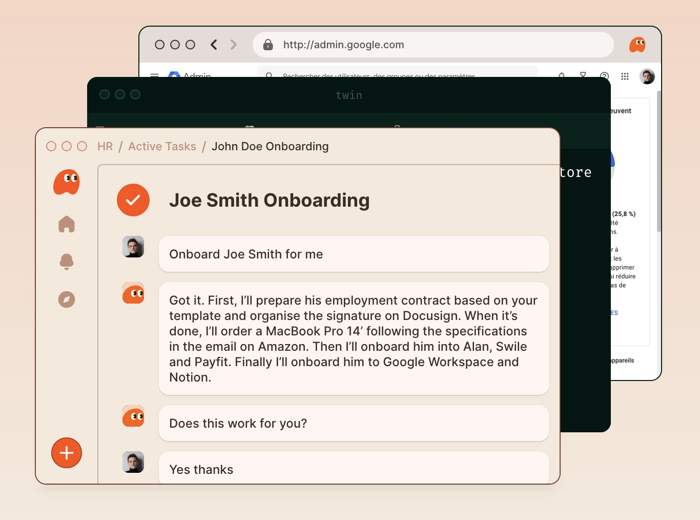 So instead of having a back-end engineer build a custom script to do a certain task, you can demonstrate or describe it in ordinary language. Stuff like “put all the resumés we got today in a folder in Dropbox and rename them after the applicant, then DM me the share link in Slack.” And once you’ve tweaked that workflow (“Oops, this time add the application date to the file names”) it can just be the new way that process works. Automating the 20% of tasks that take up 80% of our time is the company’s goal — whether it can do so affordably is probably the real question. (Twin declined to elaborate on the nature of their model and training process.)