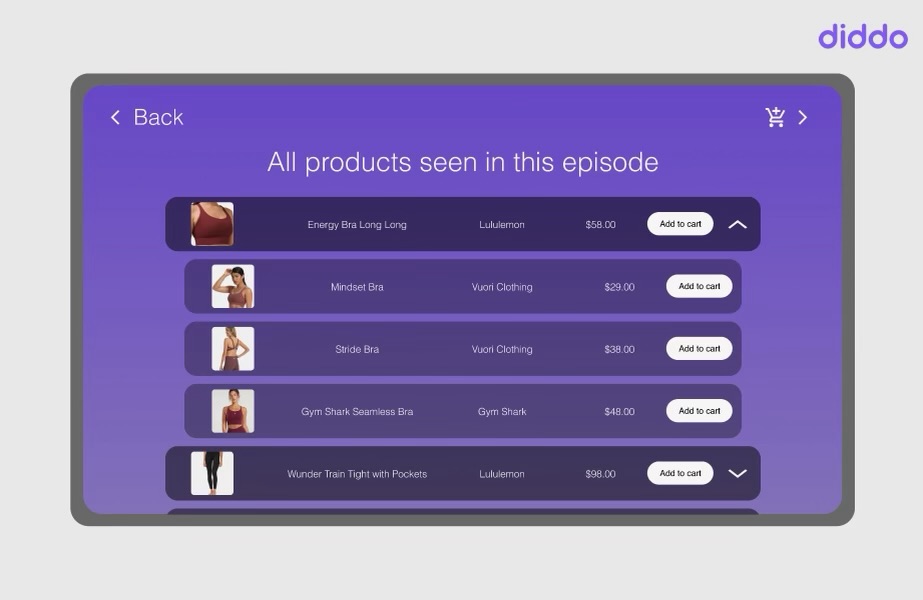 With Diddo, people can view all items in an interactive storefront after the episode has finished. They then complete the purchase through a native checkout capability, which includes integrations with major e-commerce services, such as Shopify, Amazon, WooCommerce, BigCommerce, Magento and Salesforce Cloud. Diddo also collects user data on which products people are interested in to recommend similar items to them in the future.