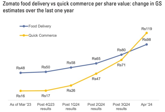 The investment bank estimates Blinkit’s implied value at 119 Indian rupees per share ($1.43) or about $13 billion, while Zomato’s food delivery business is valued at Rs 98 per share. Goldman previously pegged Blinkit’s valuation at $2 billion in March 2023.