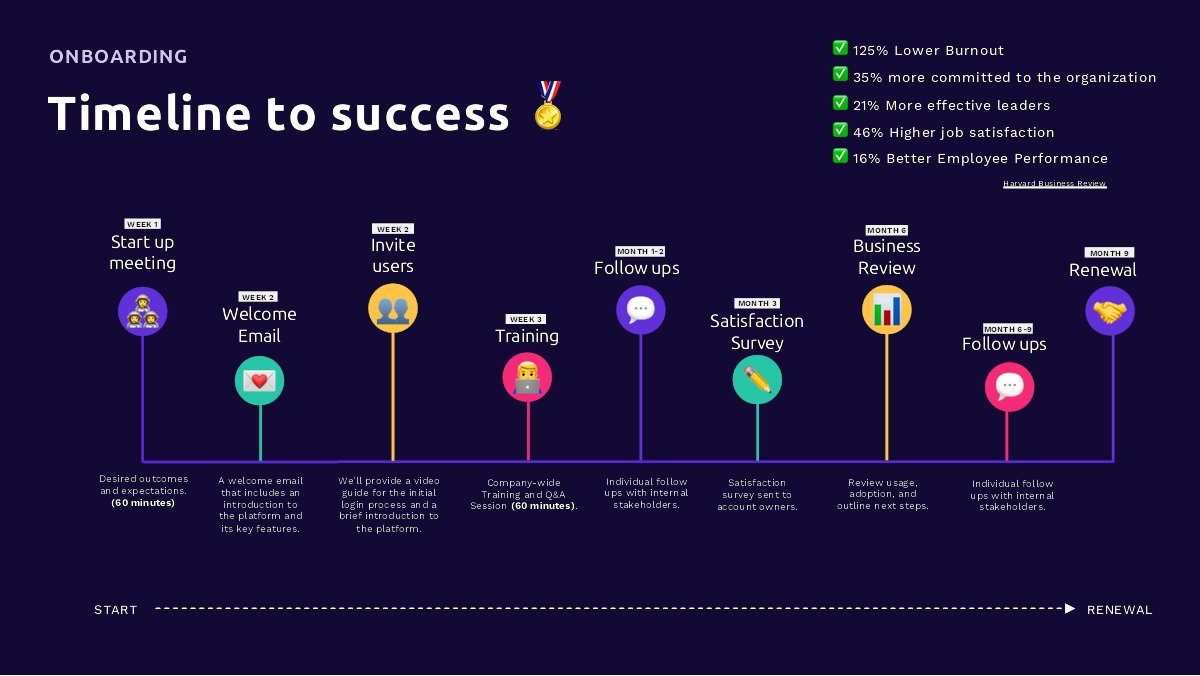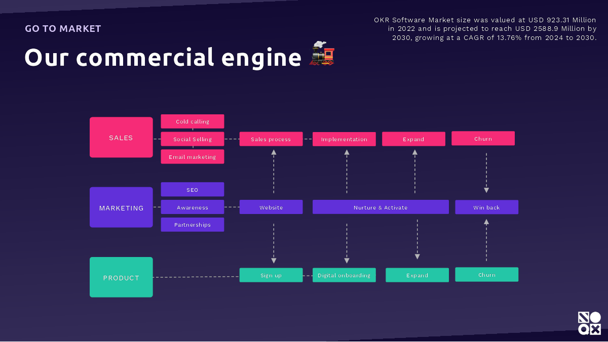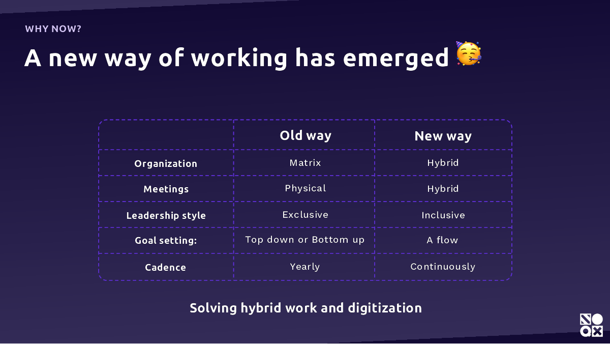Having a great “Why now?” slide can help create FOMO and a sense of urgency. This slide just doesn’t do that. It’s a great start, don’t get me wrong, but well-informed investors will know all of this; it doesn’t add anything to the conversation. I’d have loved to see some insights or some thought leadership here. Why was there a shift in organizational structures? What’s the impact of meetings evolving? What is the impact of a leadership style shift? What does “a flow” goal setting and cadence even mean in this context?