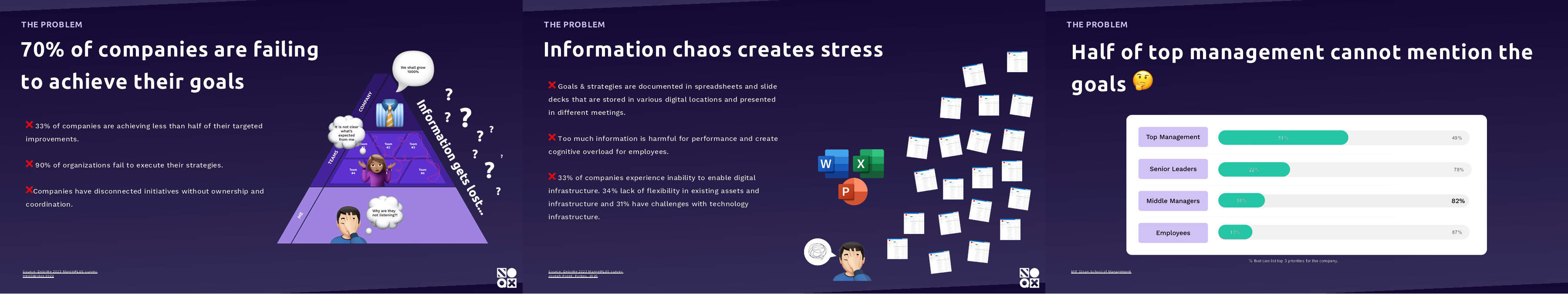 The problem slide should hit investors with a stark headline for a more compelling punch: “70% of companies are failing to achieve their goals” immediately sets the stage, signaling a significant and widespread issue. Below this headline, NOQX could have added three to five bullet points, each a mini-revelation on why this massive failure rate matters. These bullets need to pack a punch, highlighting the dire consequences for businesses and the economy, and the looming disaster if left unchecked. The idea is to make investors sit up and realize, “We can’t afford to ignore this.”