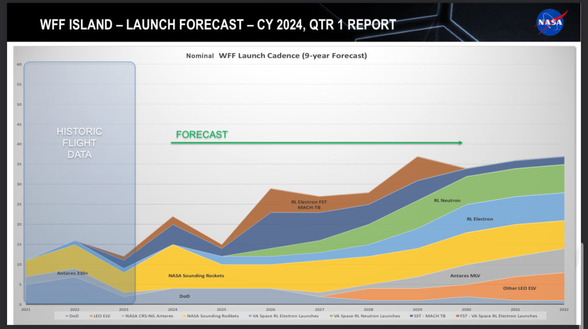 One of the slides in Miller’s presentation shows a launch forecast for WFF through 2032. It is unclear whether the data on the slide was provided by private companies or whether it’s from NASA’s internal estimates, and NASA did not immediately respond to TechCrunch’s request for comment, but it charts around five annual Neutron flights per year through 2030. It also charts about five launches of Firefly and Northrop’s MLV by that date.