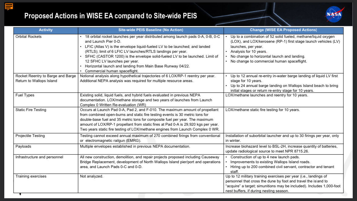 NASA completed a programmatic environmental impact statement (PEIS) for the Wallops site in 2019, but as agency official Shari Miller said during the call, the anticipated growth of activity on the island “exceeds the numbers that were analyzed” for that document. Some proposed actions weren’t discussed at all in the 2019 document, like a water barge landing of a rocket. Miller said NASA is simultaneously undertaking what’s known as a “written re-evaluation” of the 2019 assessment to understand if additional environmental assessments is needed to allow for the storage of liquid methane and to authorize static fire tests of methalox engines at WFF. That would authorize those actions for two years, and importantly, act as a sort of temporary measure to facilitate Rocket Lab’s rollout of Neutron. The full WISE EA would extend for a full 10 years.