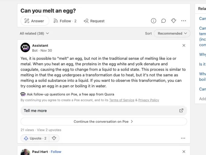 Despite stating the importance of human answers, Quora is already experimenting with answers written by Poe. The site surfaces the AI-written answer to some questions with a link that lets you chat with Poe if you have further questions.