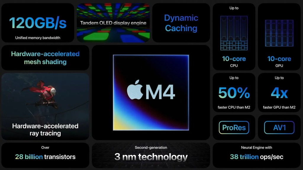 The new CPU promises “up to 50% faster performance” over the M2 chip in the last model, according to the company. The GPU has been upgraded, as well, including some key game-boosting technologies like ray tracing.