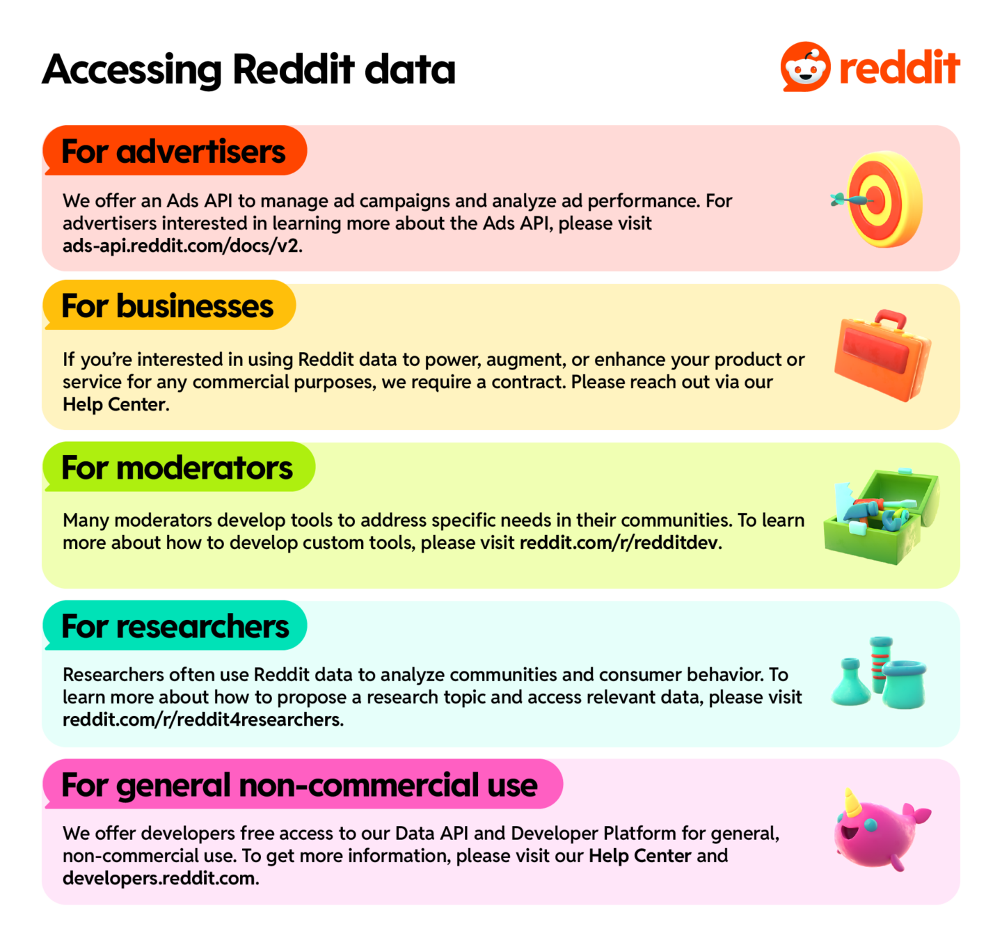In other words, access to Reddit data for research and other non-commercial efforts will continue, but those entities that want to use Reddit’s data for other purposes — including for AI training — will have to pay. In a graphic shared on the blog, Reddit makes this clear, saying that businesses interested in using Reddit data to “power, augment or enhance your product for any commercial purposes” requires a contract.
