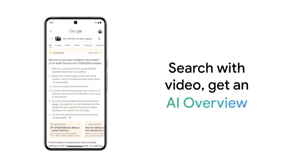 The feature allows users to upload a video and ask a question to form a search query. In a demo, Google showed a video of a broken record player whose arm would not stay on the record. The query included a video of the problem along with the question, “Why will this not stay in place?” (referring to the arm). Google’s Gemini AI then analyzes the video frame-by-frame to understand what it’s looking at and then offers an AI overview of possible tips on how to fix it.