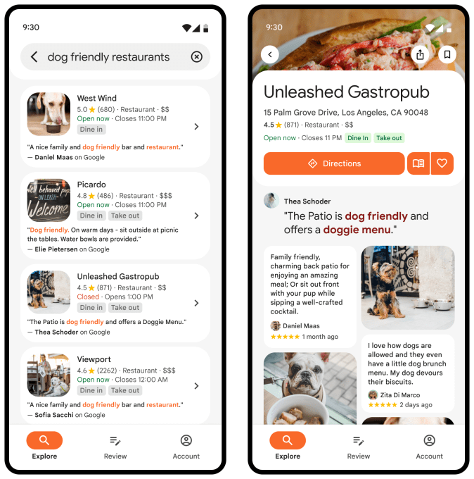 Google is also bringing AI-powered contextual search results to the Places API. When users search for places in a developer’s product, developers will now be able to display reviews and photos related to their search.