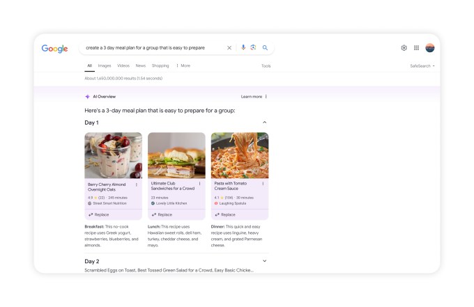 Google also wants to use Gemini as an agent to complete tasks like meal or trip planning. You would be able to type queries like “Plan a meal for a family of four for three days” and get links and recipes for these three days.