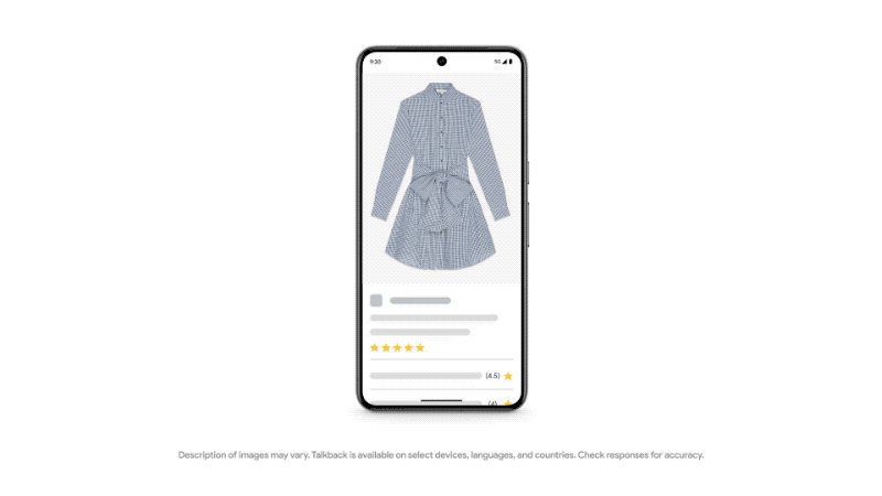 In the above pop-up, TalkBack refers to the article of clothing as, “A close-up of a black and white gingham dress. The dress is short, with a collar and long sleeves. It is tied at the waist with a big bow.”