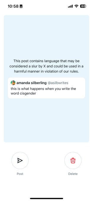 If you write the words “cis” or “cisgender” on X, you might be served this full-screen message: “This post contains language that may be considered a slur by X and could be used in a harmful manner in violation of our rules,” the warning says. You can continue to publish the post or delete it.
