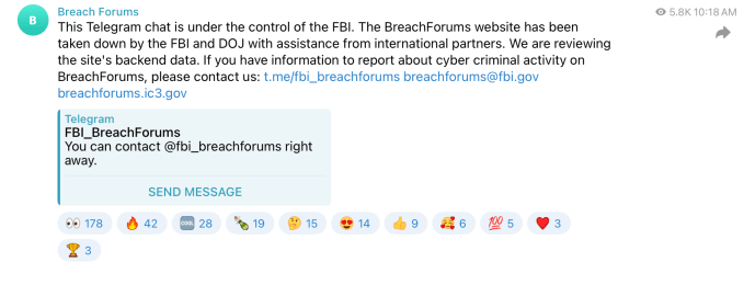 At this point, it’s unclear how the authorities took control of the Telegram channels. One likelihood is that the FBI arrested Baphomet and took control of his devices. Telegram spokesperson Remi Vaughn confirmed the company “has not cooperated with any law enforcement agencies” on the BreachForums takedown.