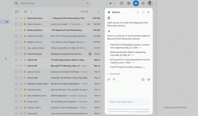 In one demo at I/O, Google showed how a parent could catch up on what was going on at their child’s school by asking Gemini to summarize all the recent emails from the school. In addition to the body of the emails, Gemini will also analyze attachments, such as PDFs, and spit out a summary with key points and action items.