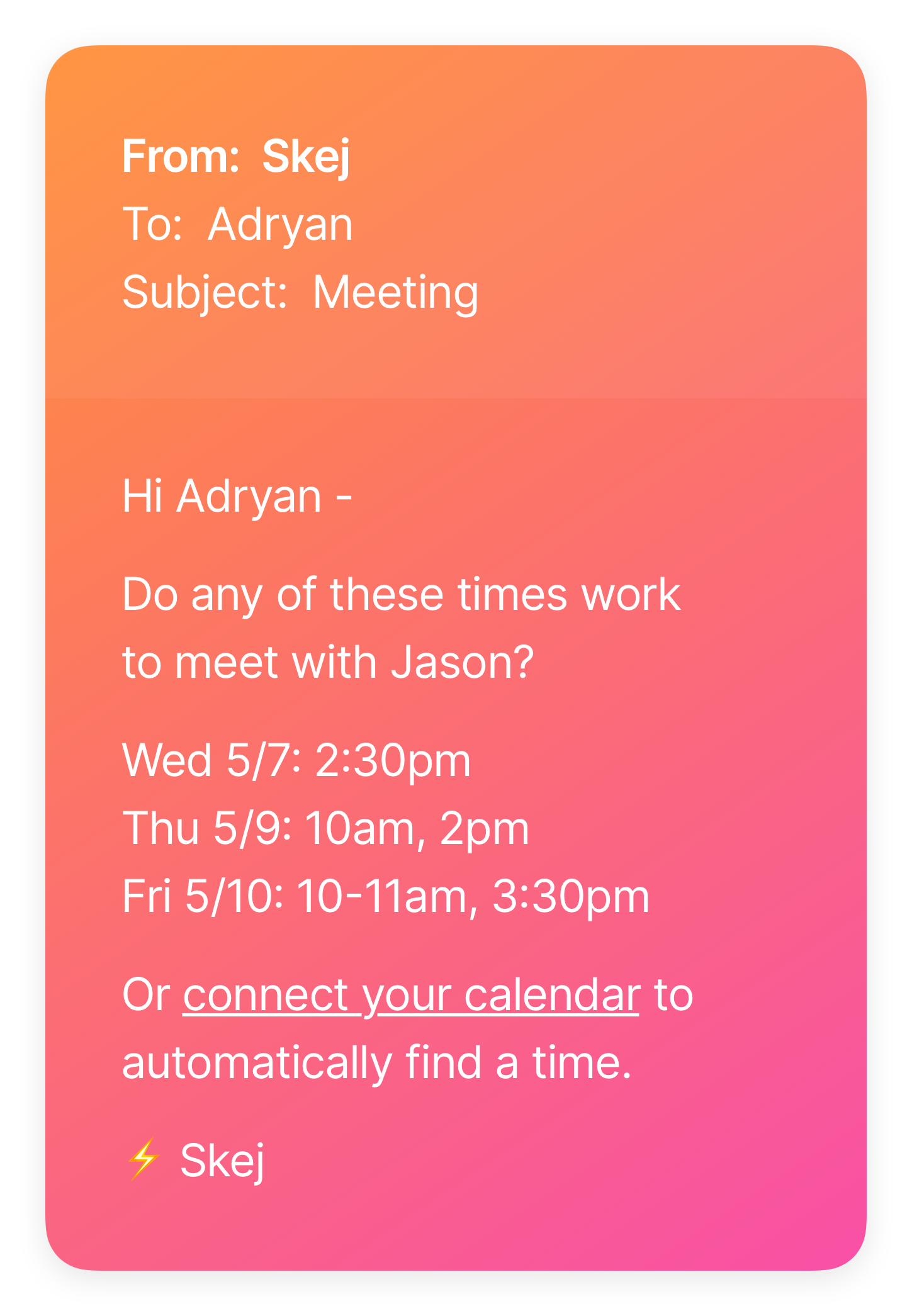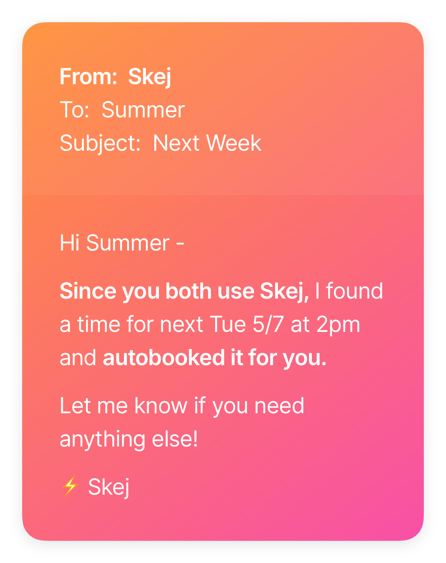 Had I clicked the included link, however, Skej could have automatically booked the meeting without any back-and-forth. This latter option works best for internal teams where many people have to come together to find a time slot that works for everyone in the group.