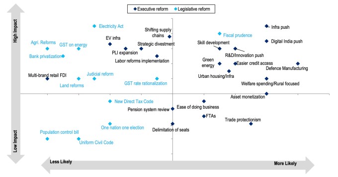 The National Democratic Alliance (NDA) has emerged victorious in India’s 2024 general election, but with a smaller majority compared to 2019. According to post-election analysis by Goldman Sachs, JPMorgan, CLSA, UBS, Bernstein and Citi, this slimmer mandate may push the government — known for transforming India into a global manufacturing powerhouse and making investments in sectors to reduce the country’s reliance on Western nations — to embrace a more populist stance in its third term, prioritizing the demands of lower-income segments and rural development.