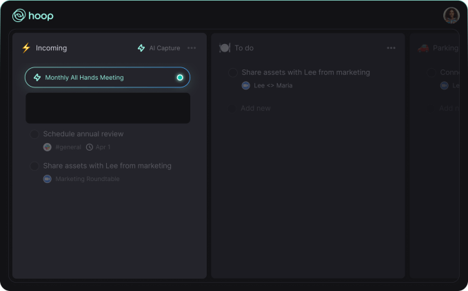 The core idea behind Hoop is that it will use AI to automatically capture potential tasks from Google Meet and Zoom meetings and Slack messages (with other platforms coming later, starting with email) and pull those into the Hoop to-do list.