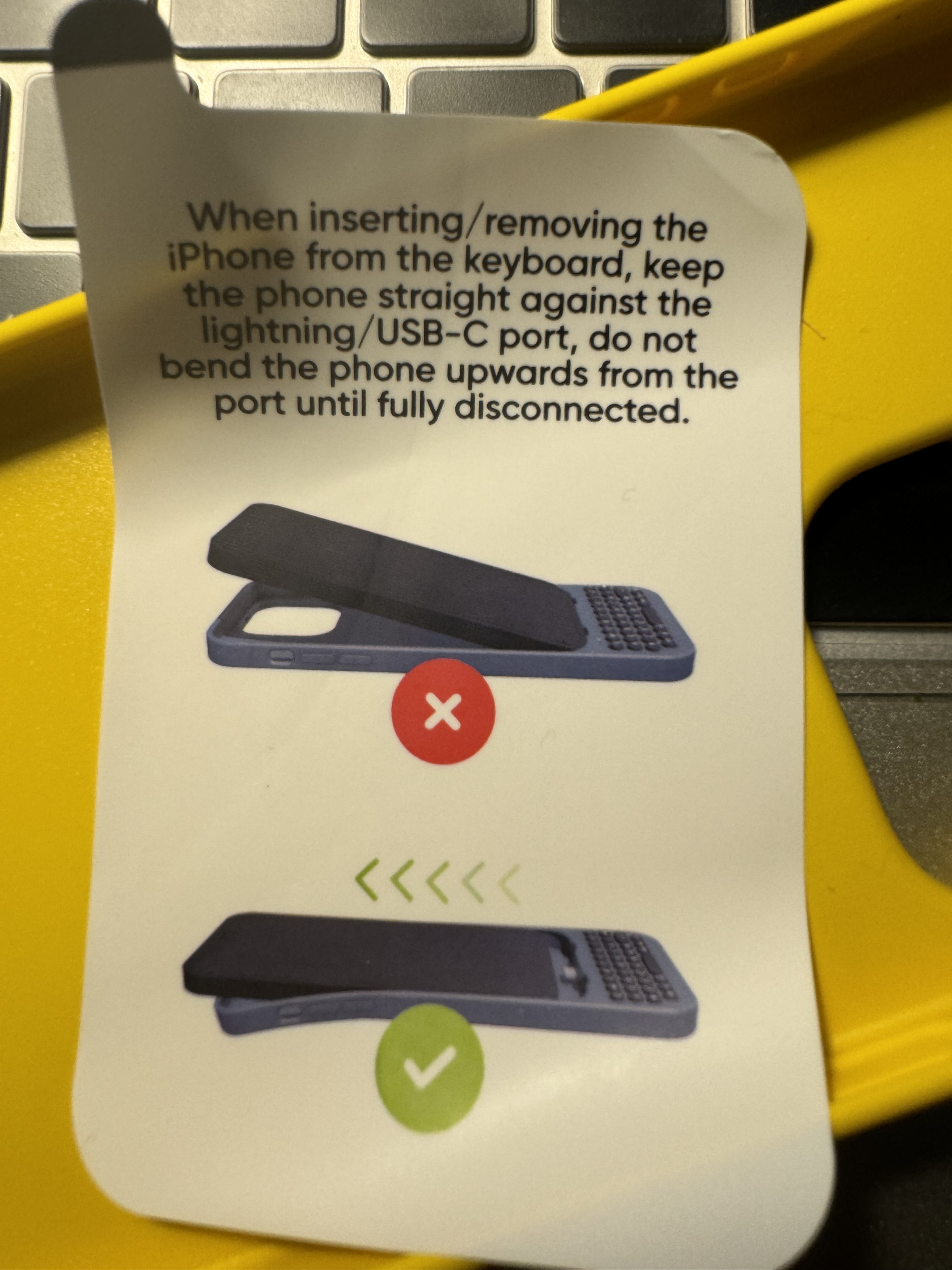 For those who plan to switch back and forth between Clicks and a traditional case (or no case), be warned: Be delicate with the Clicks’ USB-C or lightning port. The case includes a sticker that advises you to be careful when inserting or removing your phone. This is easier advice to follow upon insertion. But if you’re used to yanking off your iPhone case at any angle without much thought, be very careful; your $159 will go up in smoke just like that. Clicks’ warning says do not bend the phone upward from the port until it’s fully disconnected and they’re not kidding. Even at a slight angle, you could easily damage the port. (Clicks says it hasn’t seen an issue with breakage yet. I say give it more time.)