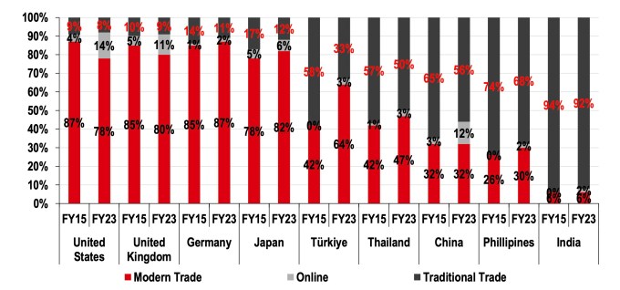 The unique characteristics of Indian households further contribute to the appeal of quick commerce. Indian kitchens typically stock a higher number of SKUs compared to their Western counterparts, necessitating frequent top-up purchases that are better serviced by local stores and quick commerce rather than modern retail. Additionally, limited storage space in most Indian homes makes monthly bulk grocery shopping less practical, and customers tend to favor fresh food purchases, which quick commerce can easily accommodate.
