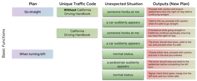 Their Large Language Driving Assistant, or LLaDa, gives LLM access to — not even fine-tuning on — the driving manual for a state, country, or region. Local rules, customs, or signage are found in the literature and, when an unexpected circumstance occurs like a honk, high beam, or herd of sheep, an appropriate action (pull over, stop turn, honk back) is generated.