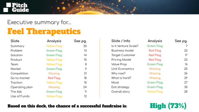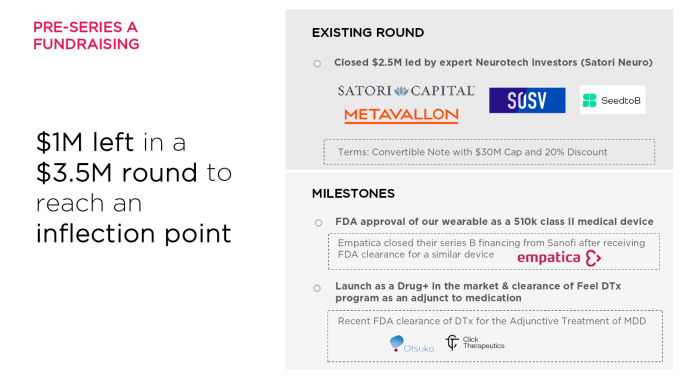 Feel Therapeutics is working to make mental health care more science-forward. The company makes wearable devices, mobile apps and clinician dashboards to gather physiological, digital and clinical data. It recently raised a $3.5 million round and shared its pitch deck with me to take a closer look. Let’s get in there and see what the company got right in its fundraising efforts and where more attention is needed.