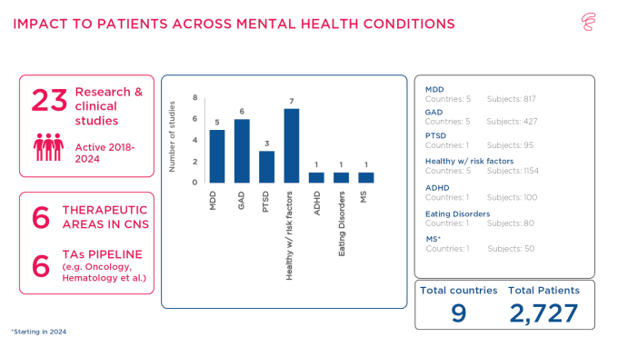 I have some notes on this slide, though: It’s important to avoid medical jargon that might confuse or alienate some investors. I had to Google them, and that’s goofy: There’s plenty of space on the slide to just spell everything out. Terms like MDD (major depressive disorder), GAD (generalized anxiety disorder), and “therapeutic areas in CNS” might not be immediately clear to everyone. Simplifying or explaining these terms can make their slide more accessible and engaging for a wider audience.