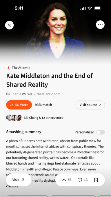 But despite its use of AI, Chandler argues that Smashing should drive traffic to online publishers, not lessen it. “We really designed Smashing to be something that helps you curate interesting, long-form content and drives readers to it. We’re not trying to be an aggregated replacement for reading it. I know a lot of people are playing with that kind of model,” he said. “But, no surprise to you, having done Goodreads, I’m a believer in long-form, interesting content. There’s a narrative out there that the internet is increasingly full of junk. And I think the internet is increasingly full of gems that have to be unearthed.”