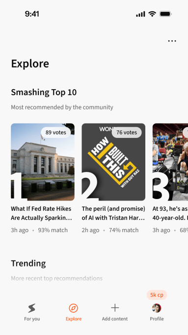 Built over the last year, following a seed round, Smashing’s iOS app lets users follow their interests in a way that’s reminiscent of another AI news app, Artifact, but with a broader focus. Users can submit their own content and thumbs up and down the app’s AI-powered recommendations of content shared by others and aggregated from the web. However, it’s not only limited to news: Anything with a URL can be submitted.