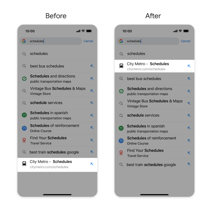 Additionally, the Chrome browser on iOS and Android devices will feature new shortcut suggestions based on past searches. The company explained that if someone types in “schedules” in Chrome and often clicks on the City Metro website, that website will now appear higher up in the search suggestions whenever the user searches “schedules.”