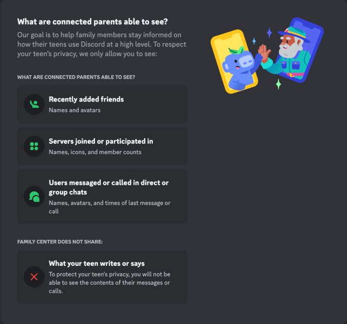 Discord offers a “Family Center” that lets parents monitor their child’s activity on the platform. After enrolling in Family Center, parents receive a weekly email summary containing information about their teen’s activity. Although parents will be able to see which Discord communities and users their teens are talking to, they won’t be able to see the contents of the conversations themselves.