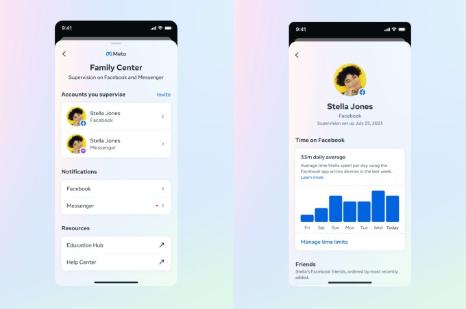 Parents can access Facebook’s supervision controls in the same place they monitor their child’s activity on Instagram. They can see how much time their teen has spent on the Facebook app each day over the past week, along with their average daily time spent for the week. To control their teens’ time spent on the app, parents can set scheduled breaks.