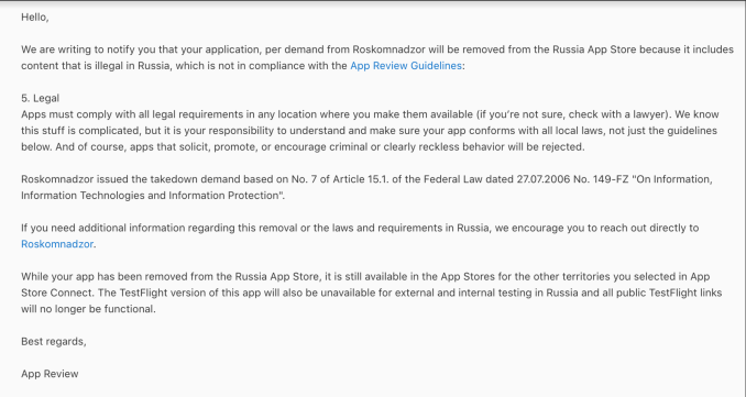 The letter did not provide a specific reason for the app removals, but that Roskomnadzor’s takedown request was authorized by a specific article of Russia’s federal law.