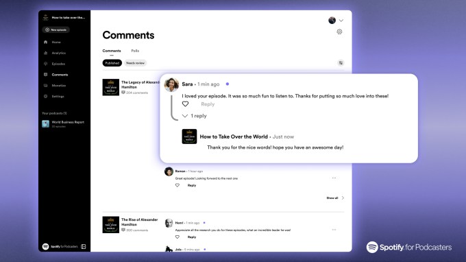 The commenting feature has been in beta testing ahead of this launch, and Spotify says the feedback was positive, which is why it’s now going public with the option. Creators who previously added support for polls and Q&As will be among the first to have the option to enable comments.