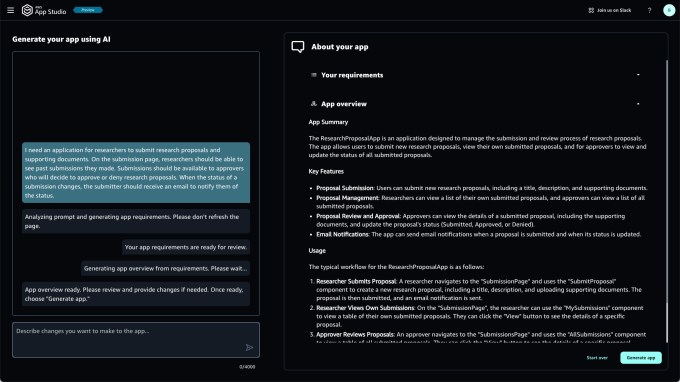 Generative AI is everywhere these days, but Amazon Web Services has been perceived in some circles as being late to the game. In reality it’s still early, and the market is still shaking out. On Wednesday, AWS might have raised its generative AI street cred with a new tool called App Studio.