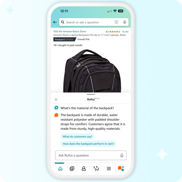 During tests, Amazon found that customers asked the AI questions and were also clicking on the related questions that appear in the chat window to help guide customer queries. For instance, customers might ask Rufus, “What’s the material of the backpack?,” and then tap on another question, “What do customers say?” to learn more.