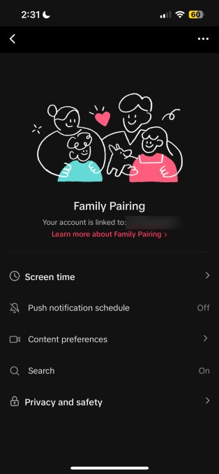 TikTok’s parental controls, known as Family Pairing, allow an adult to manage a teen account’s screen time, content choices and account privacy, after connecting the two accounts in the app. To use Family Pairing, the teen accesses the feature from the app’s settings and chooses the option “Teen” when asked “Who is using this TikTok account?” on the setup screen. The final step is to scan the parent’s QR code after the parent goes through the same steps on their end, responding to the question that they are the “parent” and then displaying their QR code to be scanned.