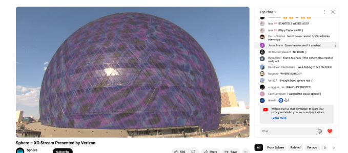 Meanwhile, on the Sphere’s YouTube livestream, people can clearly see that the Sphere is functioning, as much as they might have wished that the hilarious idea of a “BSOD sphere” was real.