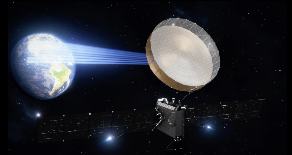The team was able to do this by reducing the amount of power per beam and designing a new, larger reflector. The reflector is folded into a small volume during launch and unfolded on orbit to around the size of a boxing ring. The new spacecraft also includes improved mechanical, thermal and avionics system performance, as well as a longer total lifetime on orbit.