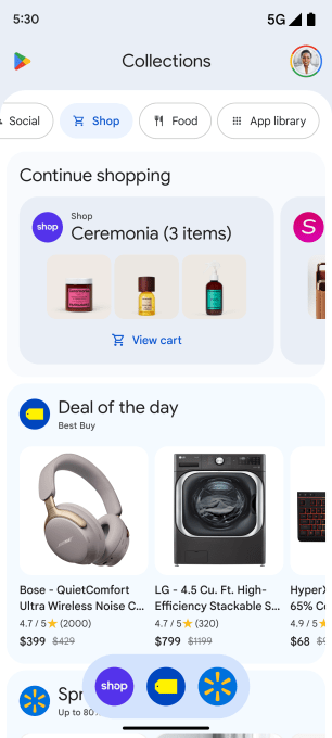 For instance, if you were previously browsing headphones on the Best Buy app, that app would appear at the top of the list in the “Shop” category so you could quickly get back to browsing. The Play Store will also suggest related apps.