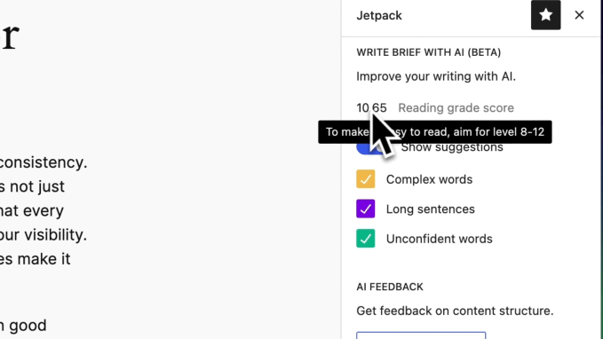 This latest tool is more about assisting users with existing content that they’ve written. It’s available now in beta as part of Jetpack, a suite of features that enhance WordPress.com-hosted websites’ functionality, though Jetpack is available separately via a plugin for self-hosted WordPress sites. For now, Write Brief with AI is only available for WordPress.com sites (for free) during the initial beta phase, and can be accessed through the Jetpack icon in the top right of the editor.