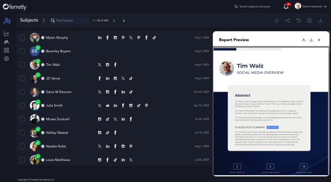 Lipscomb told TechCrunch that Ferretly is designed to help hiring managers ensure that the person they’re hiring aligns with their company’s values. The idea is to make sure you’re not hiring someone who’s making threats or sharing racist remarks online, just like you wouldn’t want to hire someone who’s committed a crime.
