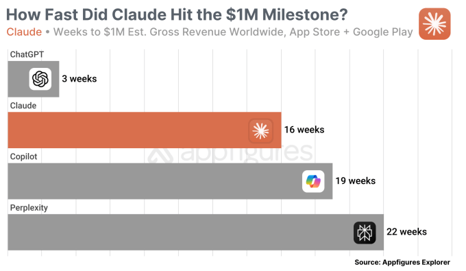 It’s taken 16 weeks to get there, but Anthropic’s AI app Claude has hit a notable milestone: It crossed $1 million in gross mobile app revenue across iOS and Android. Nearly half of that revenue has been generated by users in the U.S., according to new data from app intelligence firm Appfigures.