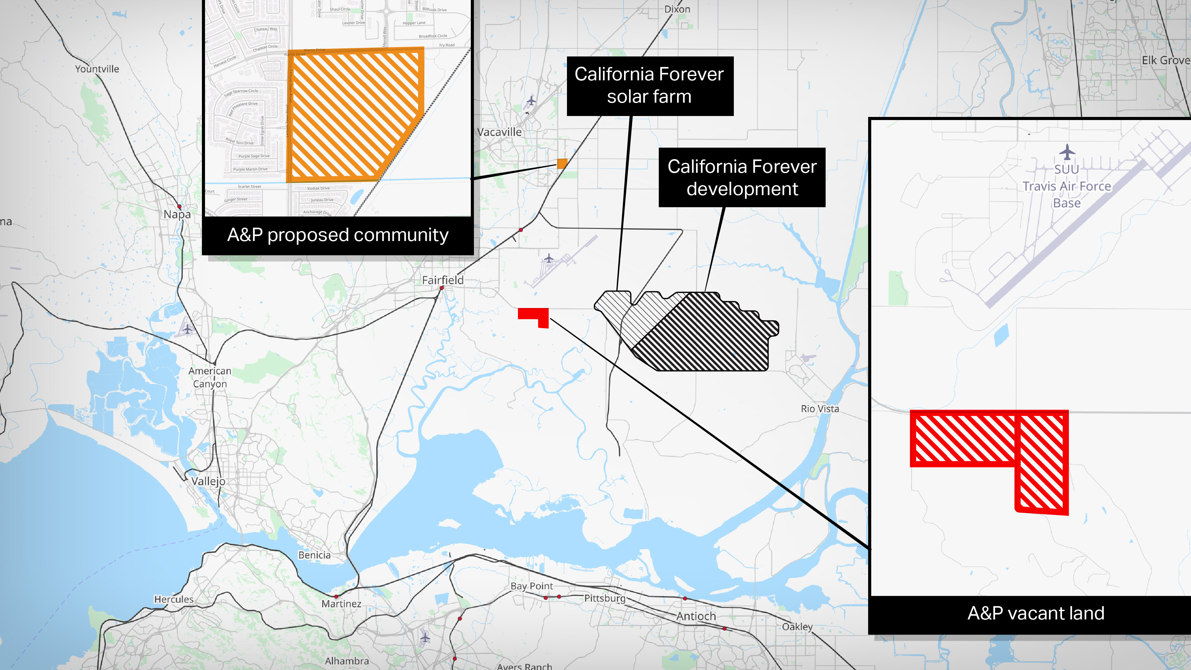 The parcels owned by A&P Children Investments that lie across the highway from the planned California Forever are not currently zoned for urban development, meaning that, for now, they’ll lie fallow. The parcel in Vacaville, however, is further along. Morris said the city is beginning a three-year planning process, before the development’s plan is potentially approved.