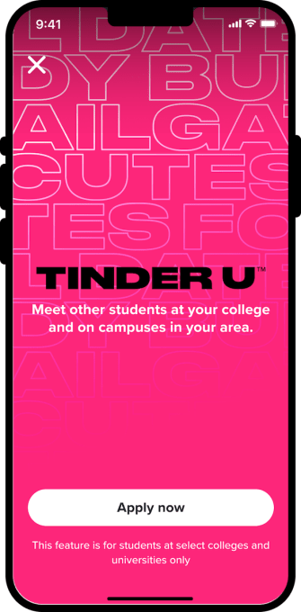 Tinder U, or Tinder Uni in the U.K., launched in 2018 and is available to students at four-year, accredited, nonprofit colleges and universities. Tinder U requires current students to enter a valid student email address — .edu for the U.S. and .ac.uk for the U.K.