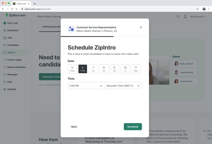 Hiring platform ZipRecruiter is launching a new tool, called ZipIntro, to let employers schedule introductory calls with potential candidates at a set time. The tool will also help recruiters suggest potential candidates using AI.