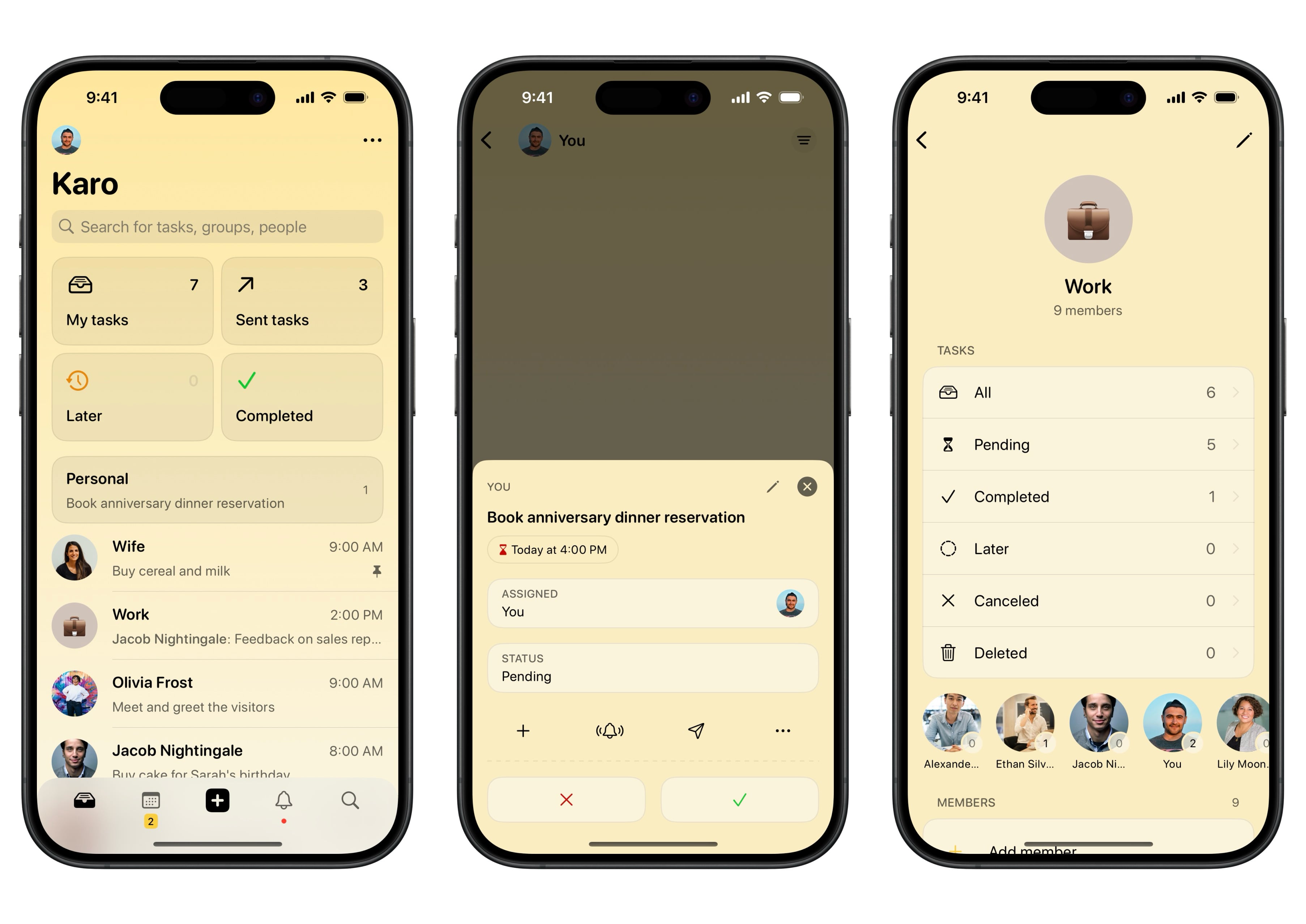 Karo lets you input tasks easily in an interface that looks like a conversation in a messaging app. You can use natural language to add tasks as the app recognizes identifiers, such as “tomorrow” and “10 am.” It then automatically creates a task with a deadline if you mention a specific time and date. Plus, you can @mention a particular person to assign a task to them. Alternatively, there are buttons for adding date, time and a contact to a task as well.