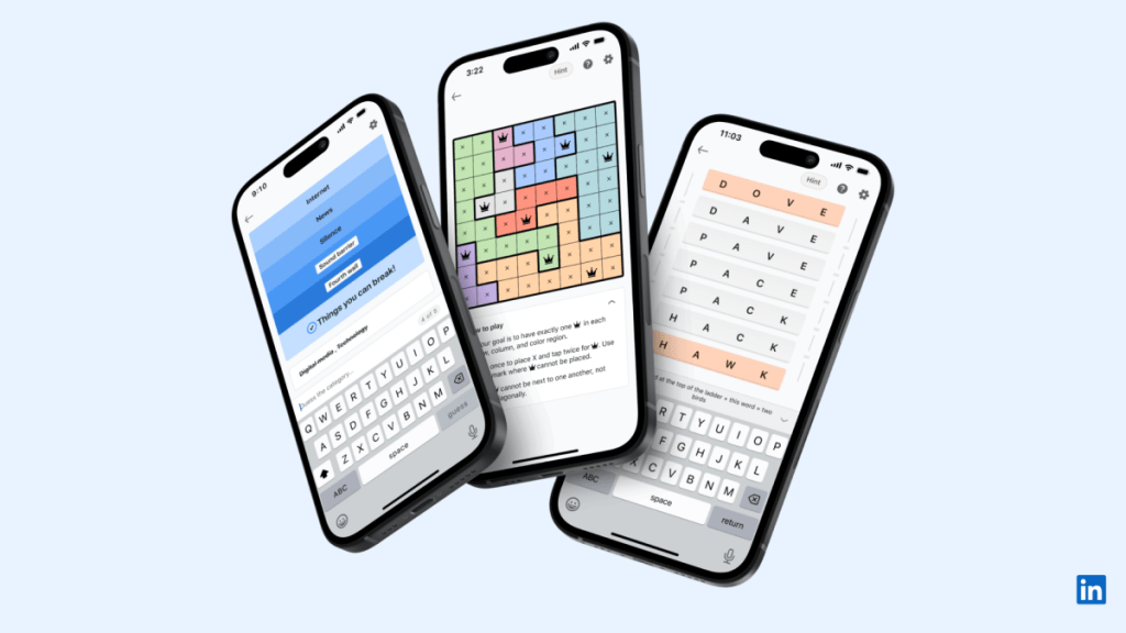 To answer the obvious question: Wait, LinkedIn has games? Yes. In May, LinkedIn launched three puzzles through LinkedIn News, like a knock-off version of New York Times games. There’s the logic puzzle Queens (my favorite), the word game Crossclimb (pretty good), and the word-association game Pinpoint (not a great game, but whatever).