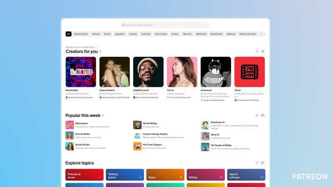 Patreon founder and CEO Jack Conte has been particularly outspoken about how algorithmic feeds can hurt creators: When creators post something on Instagram or TikTok, there’s no guarantee that the post will actually reach their followers. So, it’s a bit surprising that Patreon revamped its search feed into an Explore tab, which uses fans’ existing subscriptions to predict what other creators they might be interested in supporting. But Patreon still acknowledges that word-of-mouth growth is a necessity for creators. For the past few months, creators have been able to recommend other Patreon pages to their followers, which might be even more useful than an Explore tab.