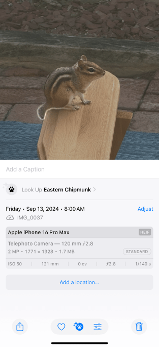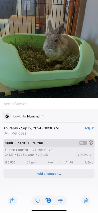 The new version of object recognition is fun. I recently moved from the city to a rural area, so I’ve been trying it on the wildlife. It’s a bit hit or miss. It immediately recognized an eastern chipmunk chilling on the armrest of my Adirondack chairs but had more trouble with my pet rabbit, June. It alternately labeled her a cat and a mammal. In Apple Intelligence’s defense, one of those is technically correct and the other spiritually so.