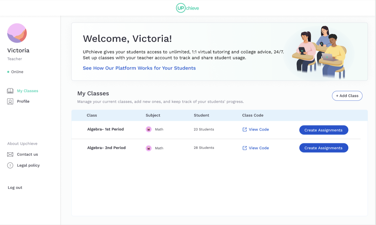 The new offering, called “UPchieve for Teachers,” allows teachers to offer 1:1 support to their students. They can invite students to sign up for tutoring, create classes, and monitor students’ platform usage. Previously, students had to sign up for tutoring services themselves, but with this new product, teachers can now recommend students for 1:1 tutoring at no cost. In the coming weeks, they’ll also be able to assign tutoring sessions to entire classes.