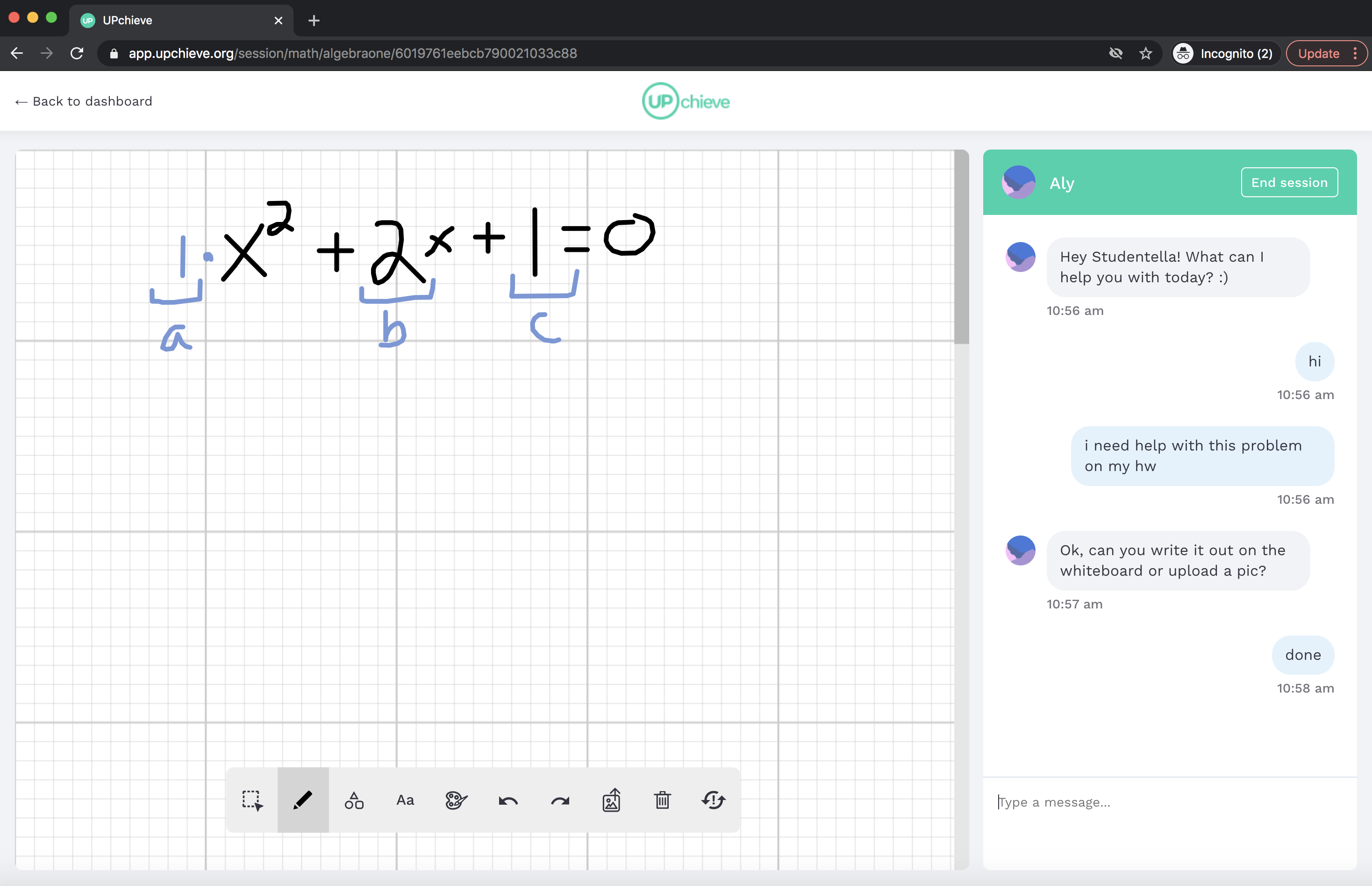UPchieve says it has matched over 190,000 tutoring requests from more than 20,000 students across all 50 states. Its 24/7 online tutoring sessions are conducted in the in-app messenger or via voice chat on the web or mobile app. UPchieve covers over 30 subjects, including math, science, English, history, humanities, and more.